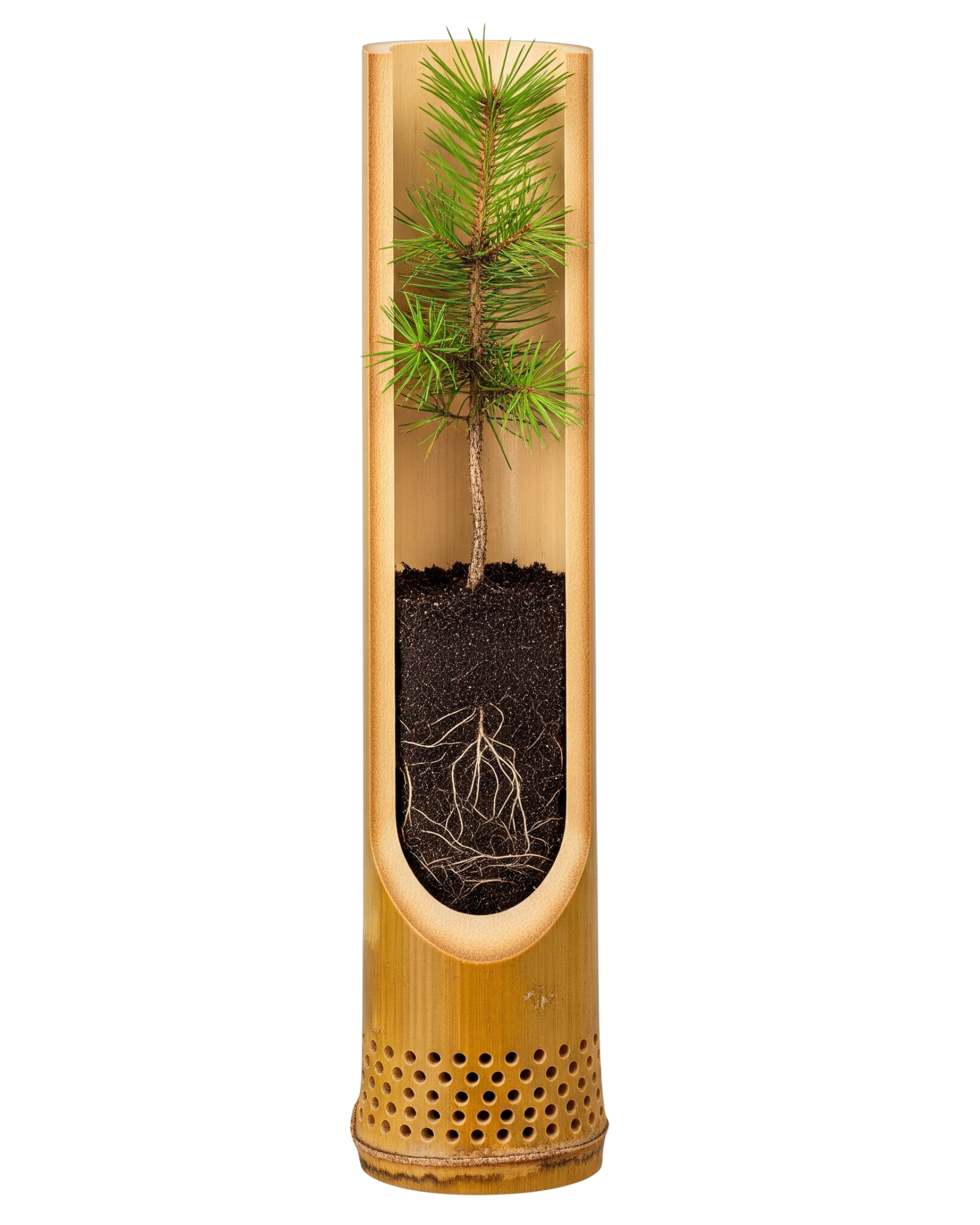 Once inserted vertically into the ground, Nature’s Needle acts like a soil syringe. The bamboo stalk serves as both a biodegradable planter and a moisture-retaining structure for new vegetation, gradually releasing nutrients and microbes into the surrounding soil. Over time, a plant grows out the top, the roots spread deep into the earth, and the bamboo stalk slowly breaks down. All the while, the leaves provide optimal shade to the ground surface, reducing evaporation and blocking harmful UV rays. This setup naturally increases moisture retention, shades the ground, and boosts microbial activity, ultimately breaking the drought cycle.